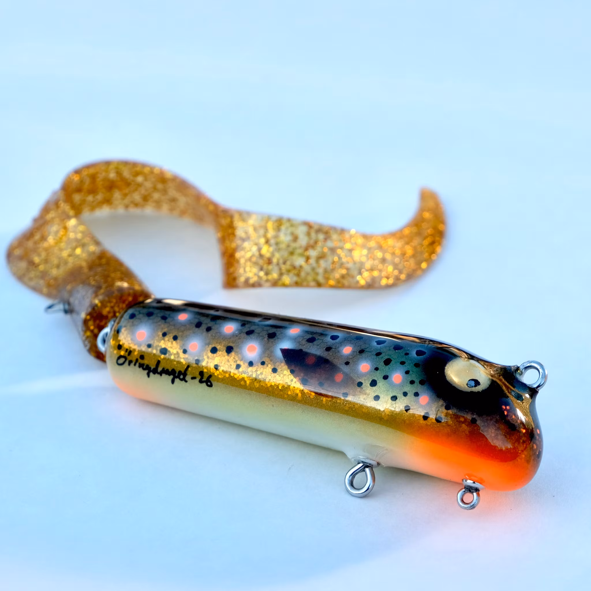 Det här betet är täljt i Al och lackat med tio lager epoxi. Långsamt sjunkande. Under hakan sitter en extra ögla för att kunna vikta betet ytterligare.