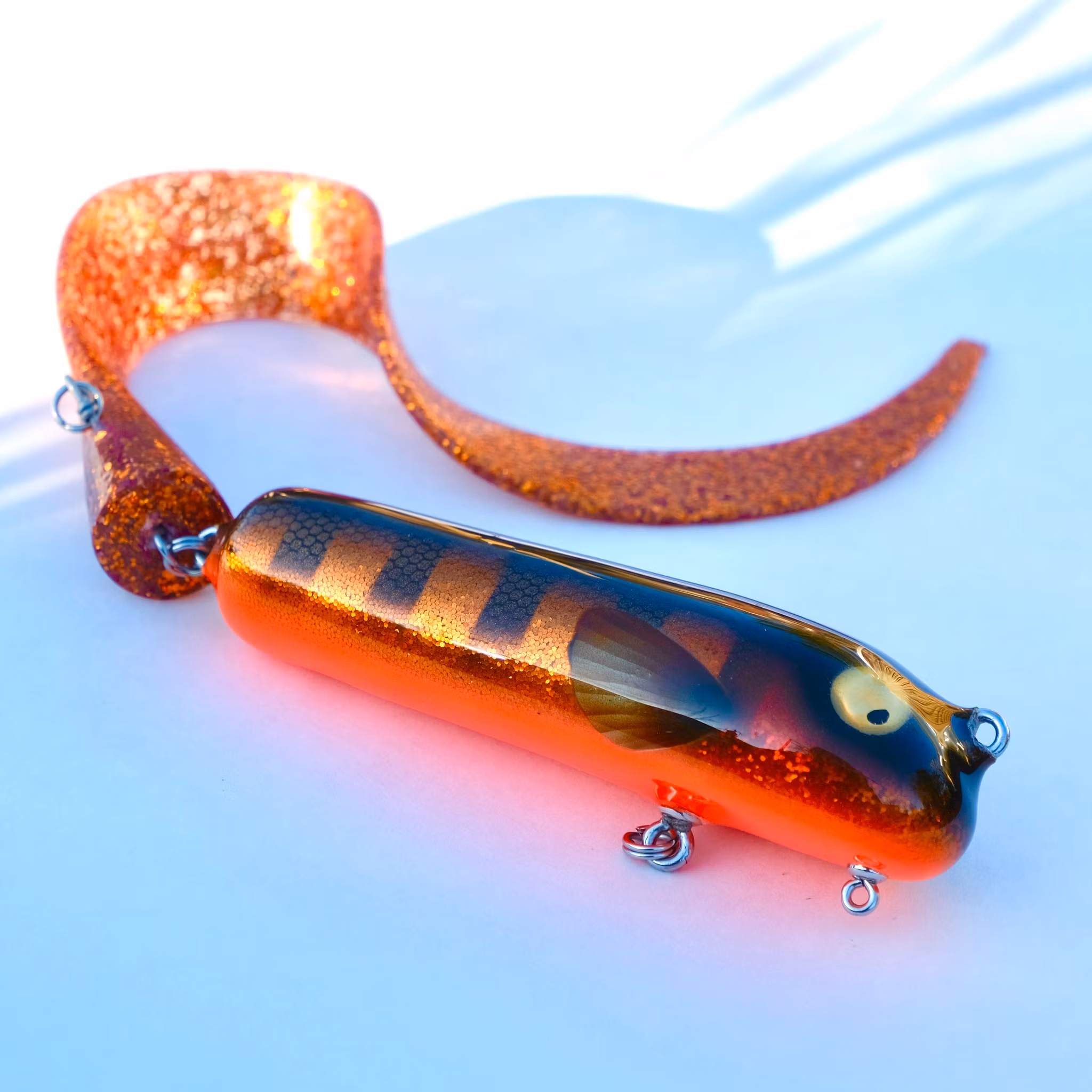 Det här betet är täljt i Al och lackat med tio lager epoxi. Långsamt sjunkande. Under hakan sitter en extra ögla för att kunna vikta betet ytterligare.